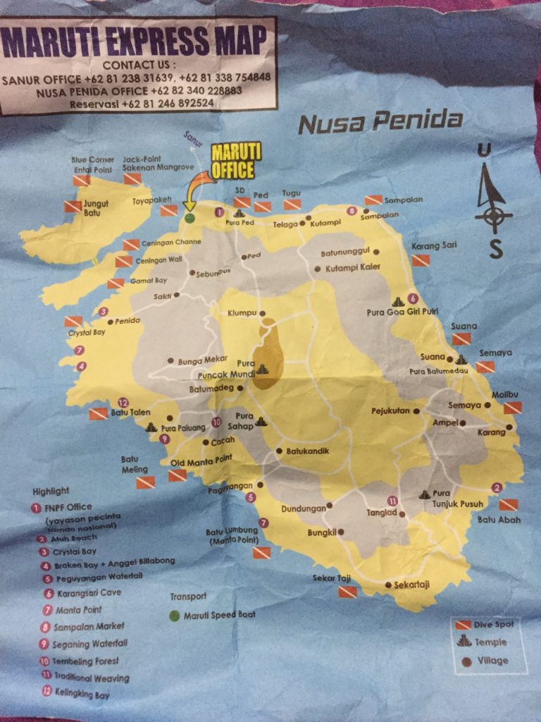 As you can see in the map, the places are basically grouped in 3 direction. South, West and East of Nusa Penida. It can be covered by minimum 3 days. The map is totally NTS (Not to scale) and no one can tell you how far is one place to another!! If you have less time, my suggestion is first see west, then south and east subsequently.